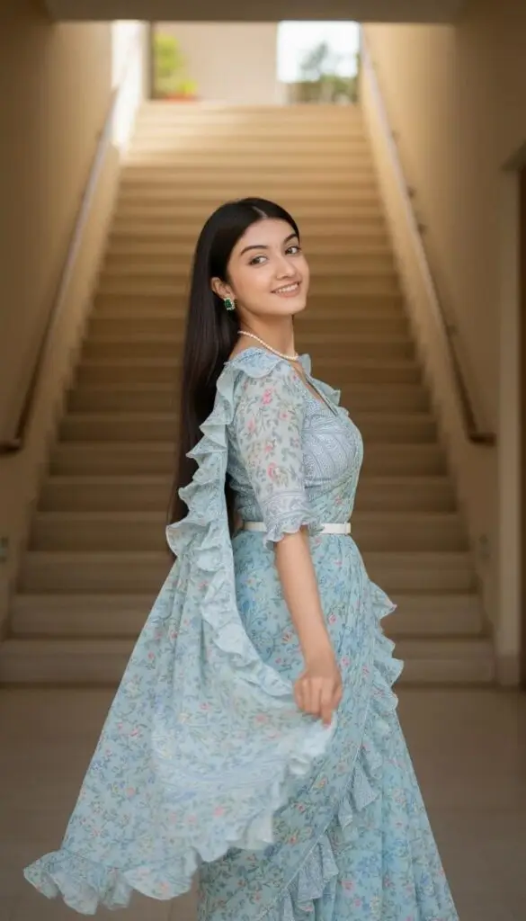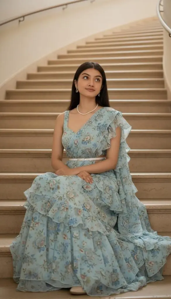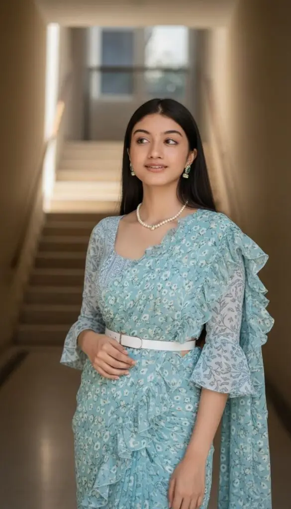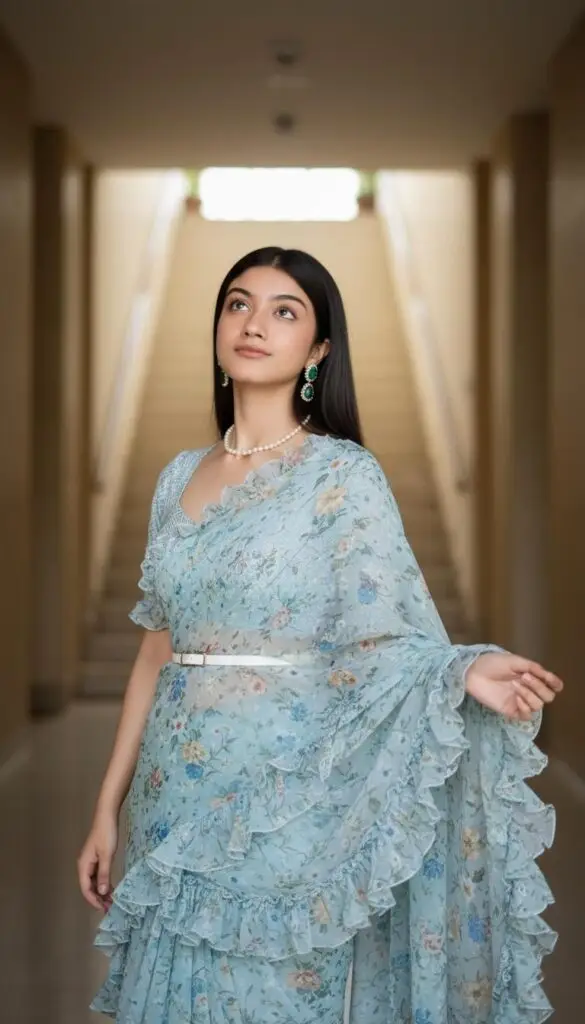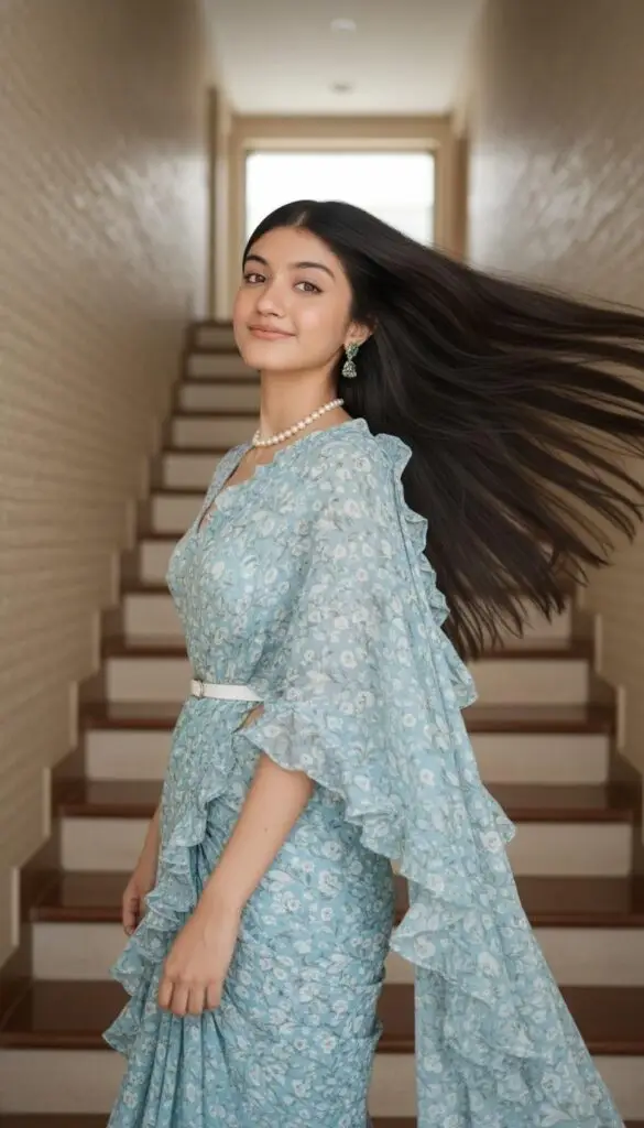 Without changing my facial features or face. Make it look realistic and remove my earrings. A young Asian woman with long straight dark hair stands in a beige corridor with stairs behind her. She wears a light blue floral saree with ruffled layers, a white waist belt, and a pearl necklace. She holds the saree pallu gently with her left hand. Natural daylight with soft shadows, sharp details on fabric and face, high realism, and a professional photoshoot aesthetic.